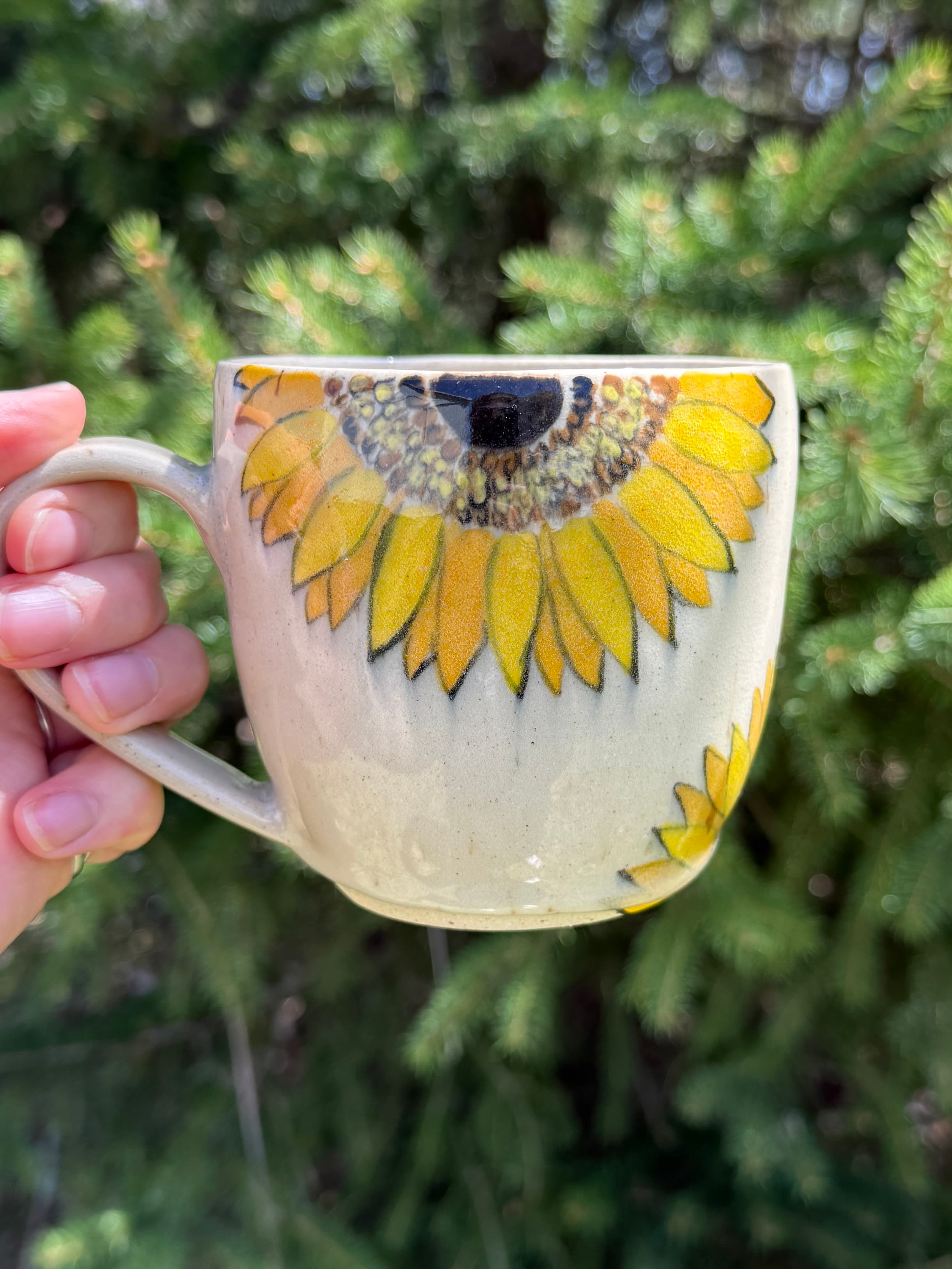 Handpainted sunflower mug on speckled stoneware. At nature school, my forest name is "Sunflower" - this is where the inspiration for these mugs came from.