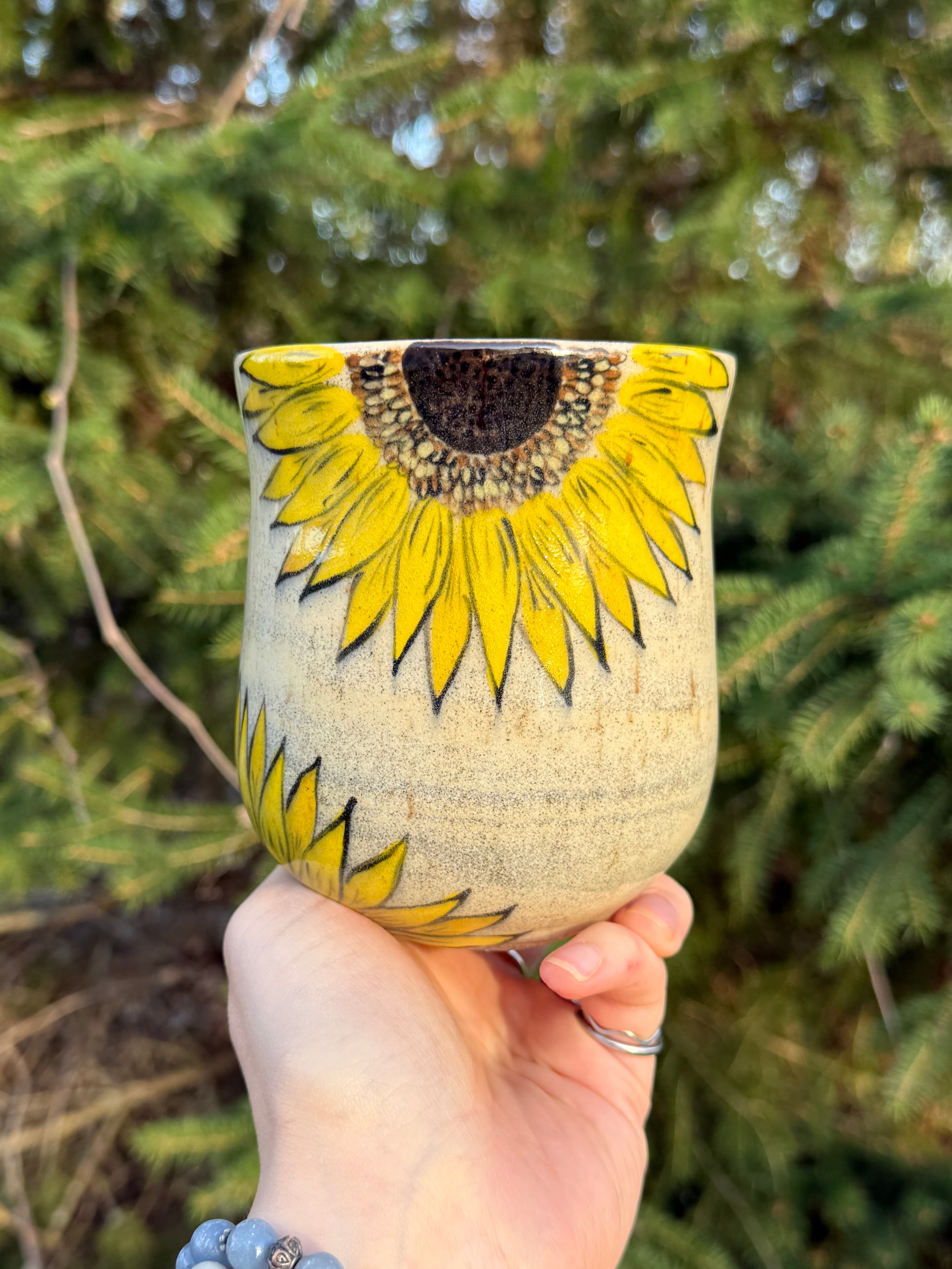 A handpainted sunflower cup. The cup is made with a mix of speckle and granite clay to give it the swirly kind of pattern in the background.